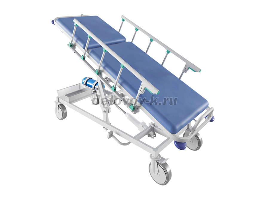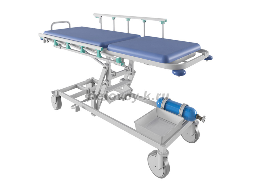 Тележка медицинская предназначена для размещения больных внутри больничных помещений. Лежак тележки двухсекционный; спинная секция ложа регулируется по углу наклона с помощью газовых пружин; регулировка угла наклона функций Тренделенбург/Антитренделенбург с помощью газовых пружин; по боковым сторонам каркаса тележки установлены прорезиненные роликовые бамперы; колеса поворотные, самоориентирующиеся, из немаркой серой резины, два колеса – с индивидуальным тормозным устройством; два боковых складывающихся ограждения; в комплект входит штатив для внутренних вливаний, металлическая сетчатая корзина, крепление для кислородного баллона; поставляется в разобранном виде.